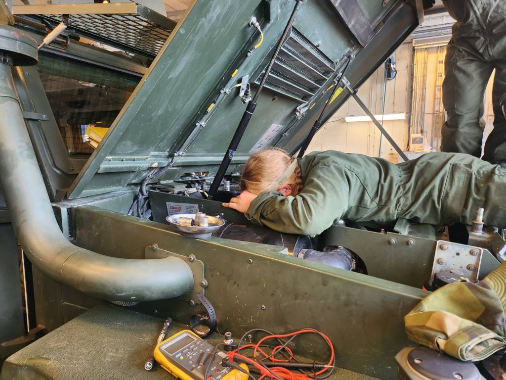 GSS/T-mekaniker byter startmotor på en av bataljonens terrängbilar. Foto: 123. skyttekompaniet