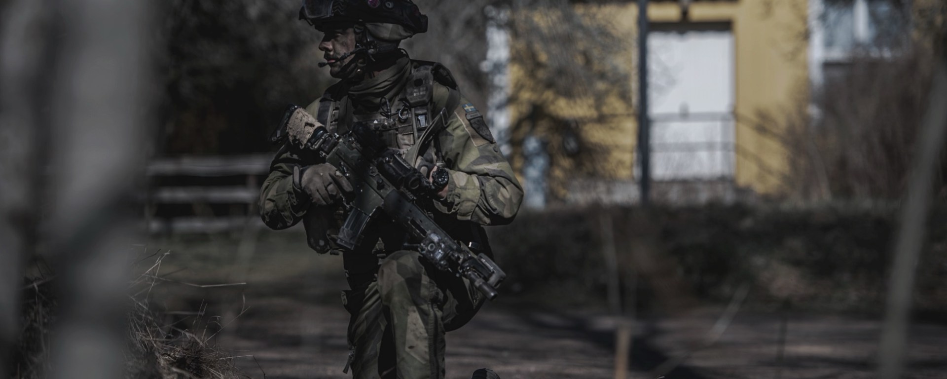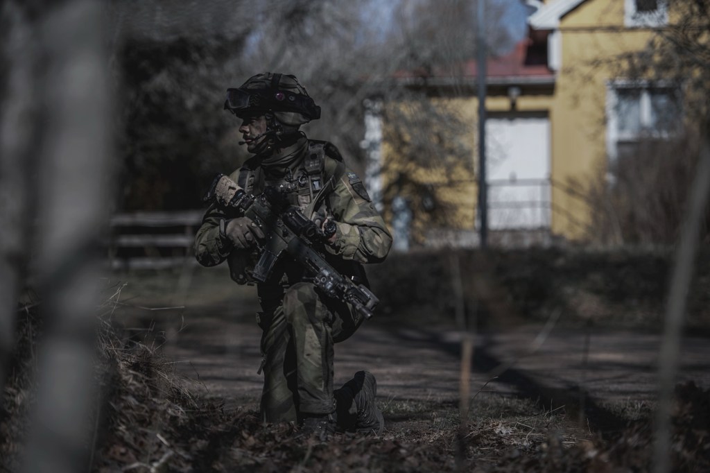 Spaningssoldat från MekB4 rekar terrängen innan brigadens anfall påbörjas. Övning Sydfront 21. Foto: Joel Thungren, Försvarsmakten