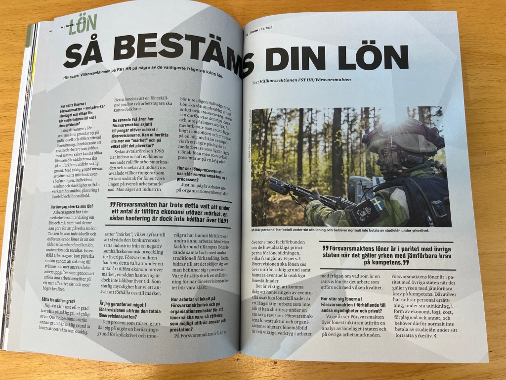 I Försvarets Forum skriver FST HR att Försvarsmakten har valt att under ”ett antal år” lägga sig över märket i lönerevideringen. Det vi ska minnas är dock att Försvarsmakten under ett antal år låg under märket i lönerevideringen. Och att lönerna från början låg på en extremt låg nivå.